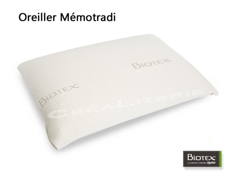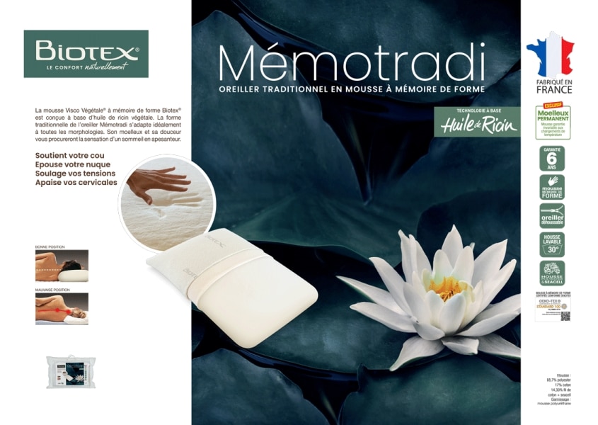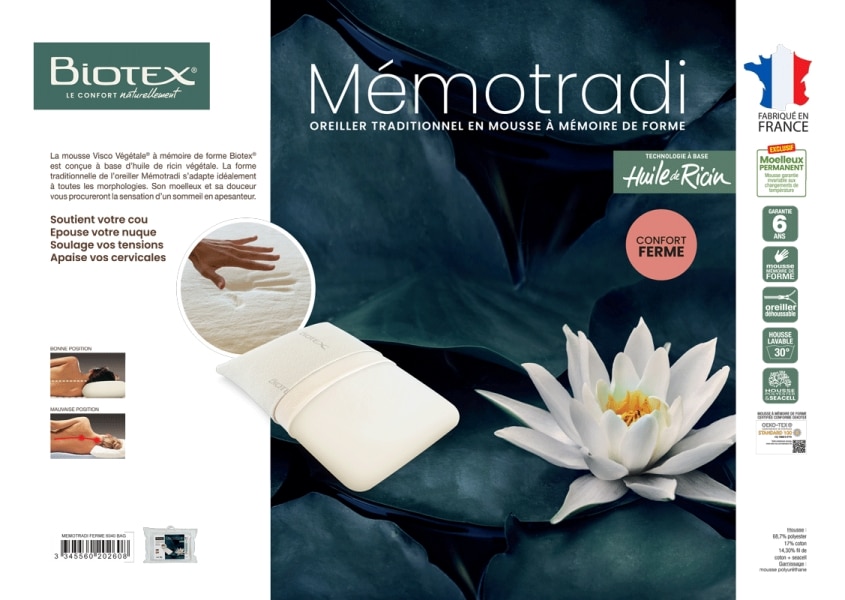 Oreiller Biotex Mémotradi en mousse végétale à mémoire de forme à base d’huile de Ricin Fabriqué en France par BIOTEX. ...