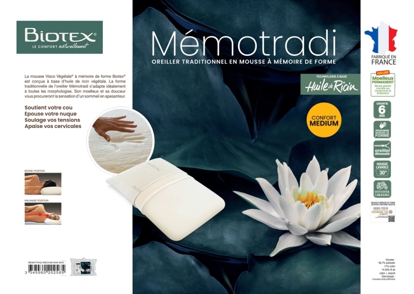Oreiller Biotex Mémotradi Médium en mousse végétale à mémoire de forme à base d’huile de Ricin Fabriqué en France par...