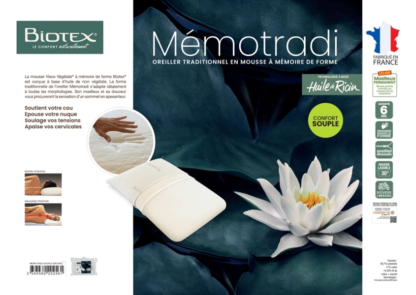 Oreiller Biotex Mémotradi Souple en mousse végétale à mémoire de forme à base d’huile de Ricin Fabriqué en France par...