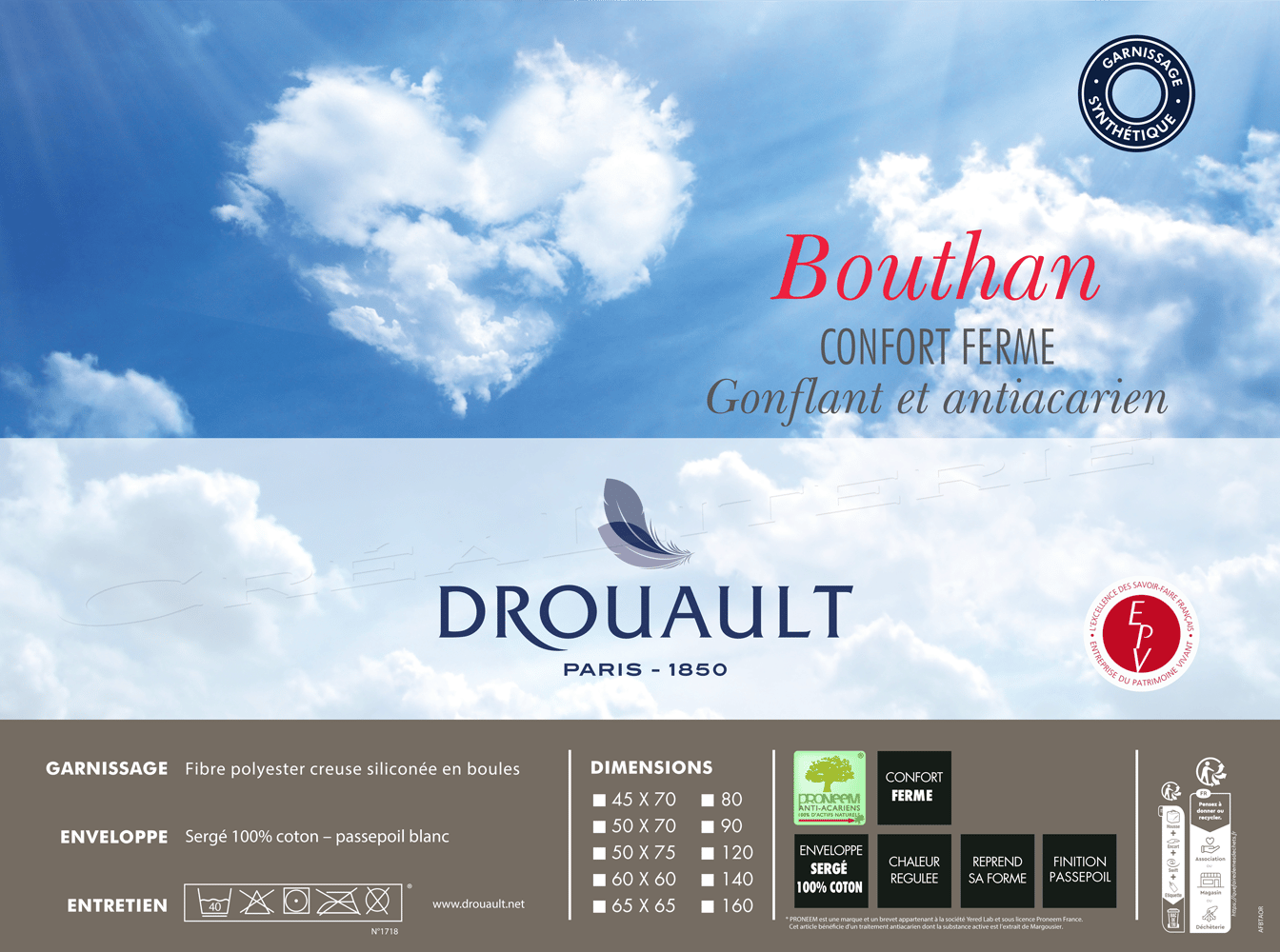 Oreiller Drouault Bouthan fibre polyester creuse siliconée en boules Fabrication Française par Drouault . Oreiller BOUTHAN 100% fibre polyester creuse siliconée...