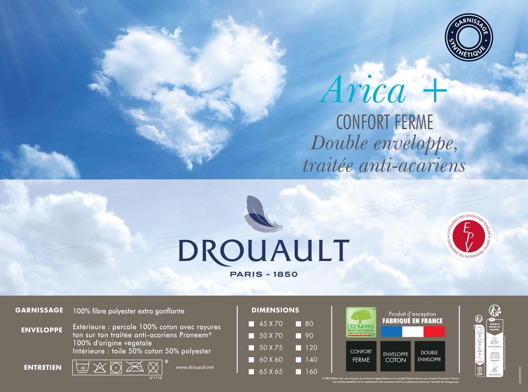 Oreiller ARICA PLUS fibre polyester creuse siliconée Fabrication Française par Drouault . Oreiller ligne soins du sommeil de DROUAULT ....