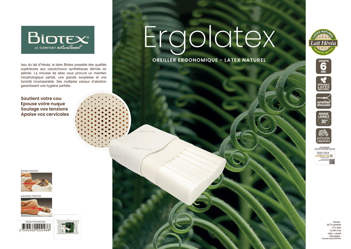 Oreiller ERGOLATEX en latex végétal naturel Fabriqué en France par BIOTEX. Oreiller Ergolatex en latex naturel à base de lait...