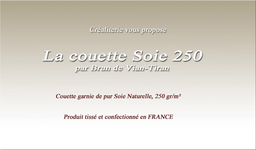 Couette Soie Naturelle 250 g/m² Fabrication Française par Brun de Vian-Tiran. Couette SOIE Naturelle 250 gr/m² en 100% Soie Naturelle, tissée...