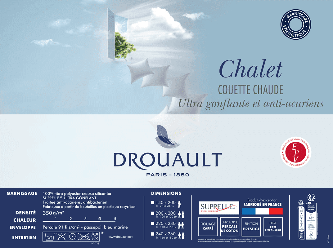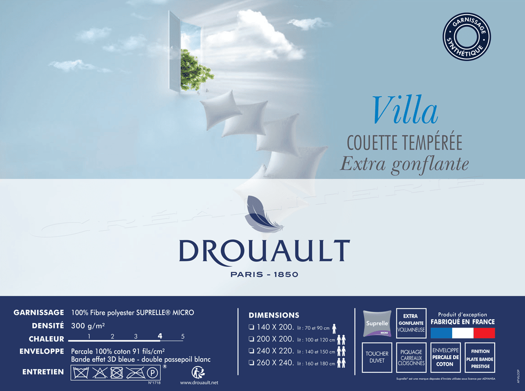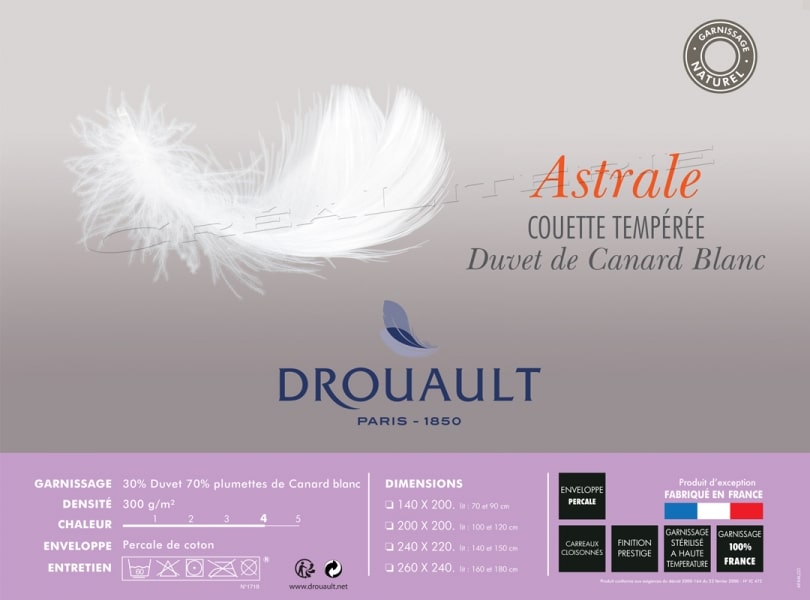 Couette OURAL EXTRA LIGHT 200 g/m² microfibre ultra fine douceur extrême SUPRELLE® MICRO extra gonflante Fabriquée en France par DROUAULT. Couette...