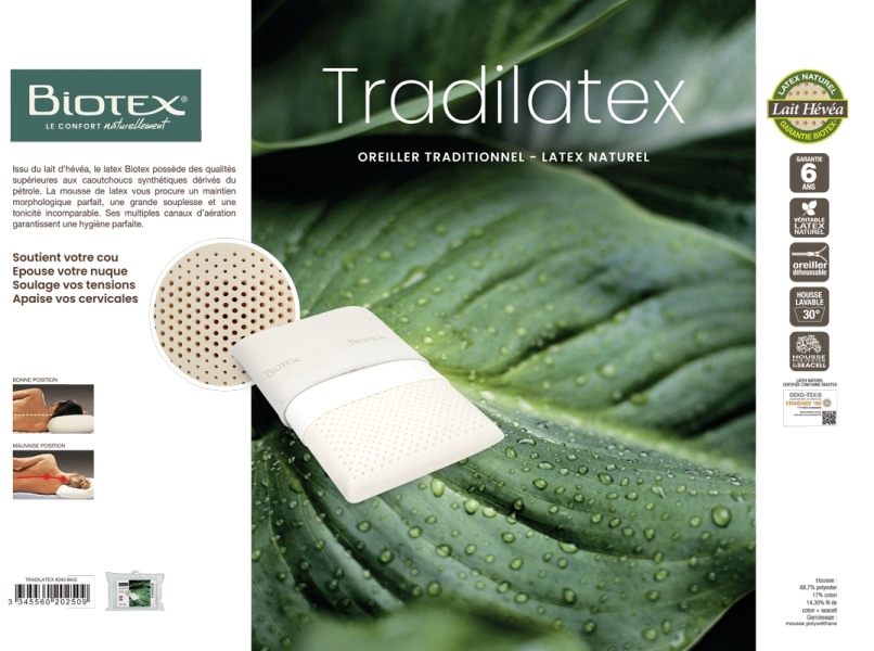 Oreiller TRADILATEX en latex végétal naturel Fabriqué en France par BIOTEX. Oreiller Tradilatex en latex naturel à base de lait d’hévéa,...