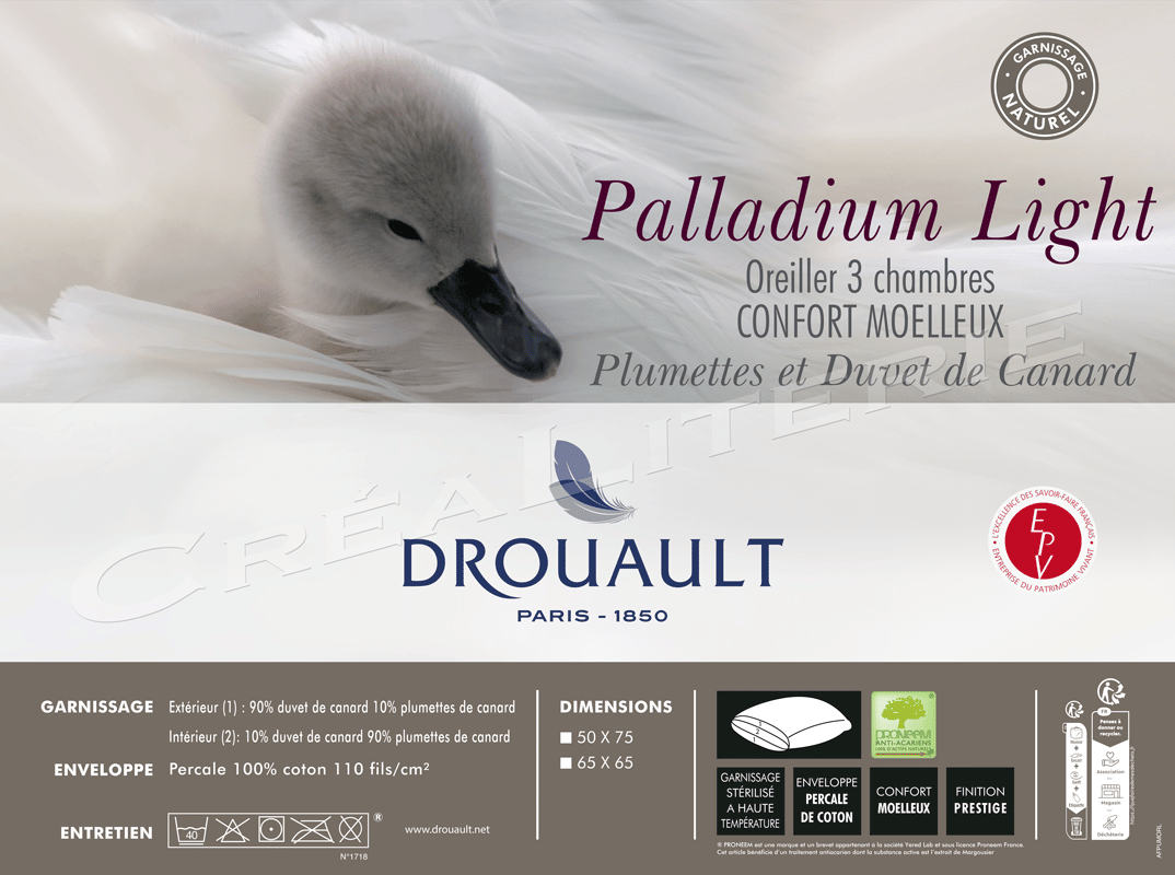 Oreiller PALLADIUM LIGHT en duvet de Canard, 3 chambres, traité anti-acariens Proneem® 100% d’actifs naturels Fabriqué en France par DROUAULT....