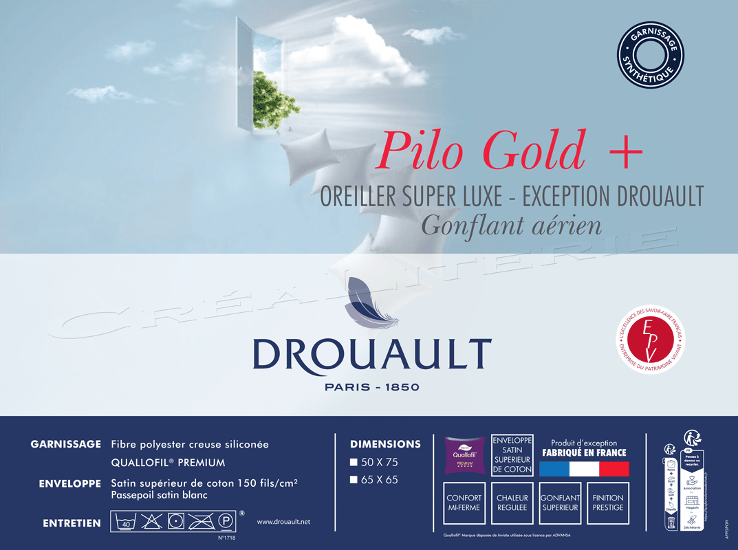 Oreiller PILO GOLD Plus mi-ferme Super Luxe Fibre creuses siliconée QUALLOFIL® PREMIUM, GONFLANT AERIEN Fabriqué en France par DROUAULT. Oreiller...