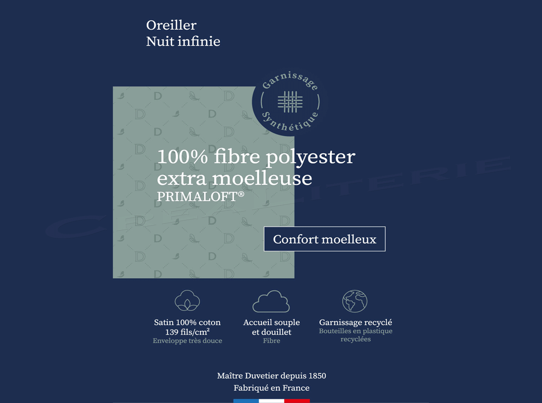 Oreiller Nuit Infini moelleux, 100% fibre douceur absolue Primaloft fabriquée à partir de bouteilles en plastique recyclées, enveloppe satin 100% coton...