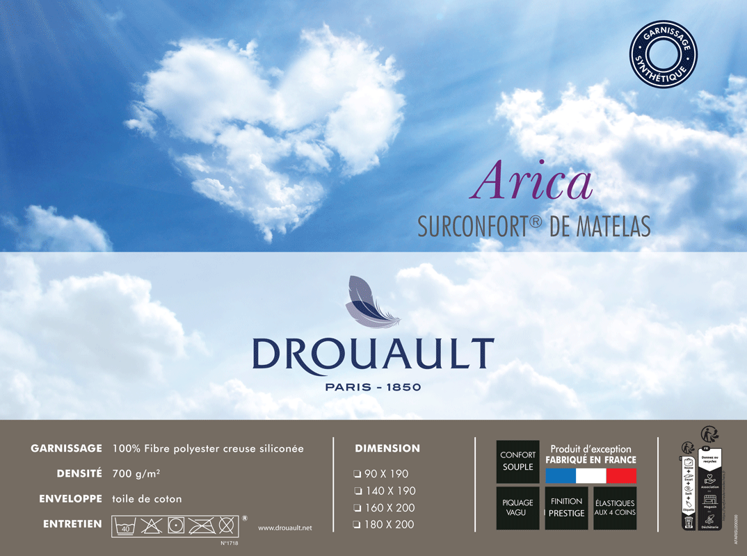 Surmatelas DROUAULT ARICA 700 g/m² fibre polyester creuse siliconée Fabrication Française. Ligne Bien-être de DROUAULT. Surmatelas ARICA 700 gr/m² 100%...