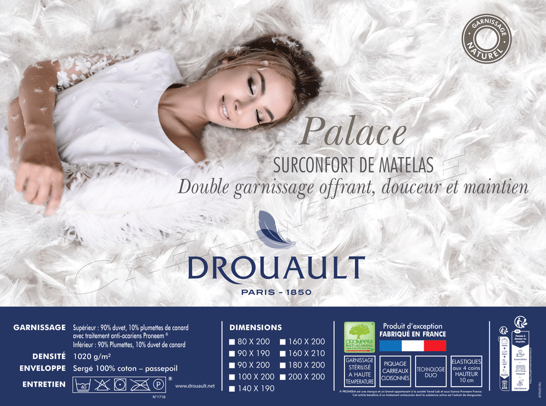 Surmatelas Dourêve 1700 gr/m² duvet oie et canard Fabriqué en France par DROUAULT. Surmatelas DOURÊVE 1700 g/m² duvet d’oie et...