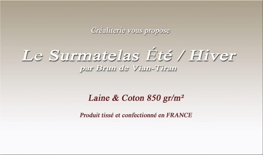 Surmatelas Été/Hiver 850 g/m² en Laine et Coton Fabrication Française Brun de Vian-Tiran. Surmatelas ÉTÉ/HIVER 850 gr/m² en 100% laine Vierge...