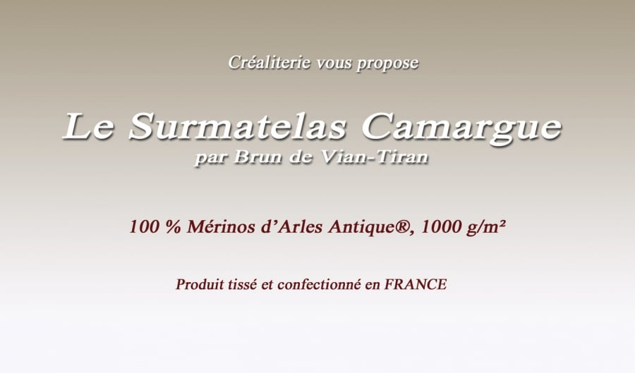Surmatelas CAMARGUE 1000 gr/m² Piquage Meltem en laine de mérinos d’Arles antique® par Brun de Vian-Tiran. Surmatelas CAMARGUE 1000 gr/m² en...