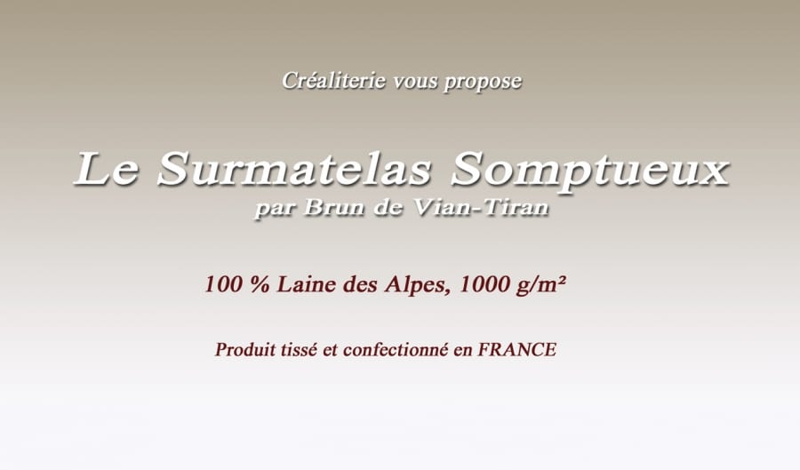 Surmatelas Somptueux 1000 gr/m² en laine des Alpes Piquage Meltem Fabrication Française par Brun de Vian-Tiran. Surmatelas SOMPTUEUX 1000 gr/m² en...