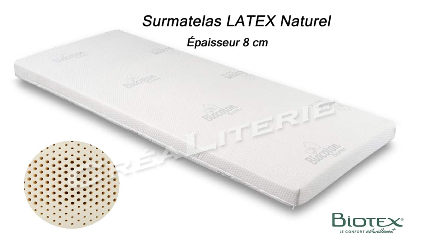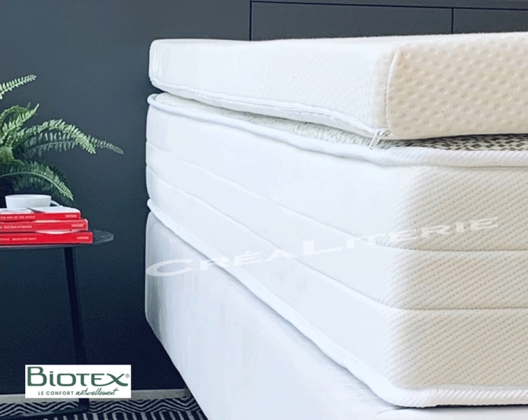 Surmatelas Latex naturel Végétal à base de lait d’hévéa Naturel Densité 80 kg/m3 Housse bio coton Fabrication Française par Biotex. Surmatelas...