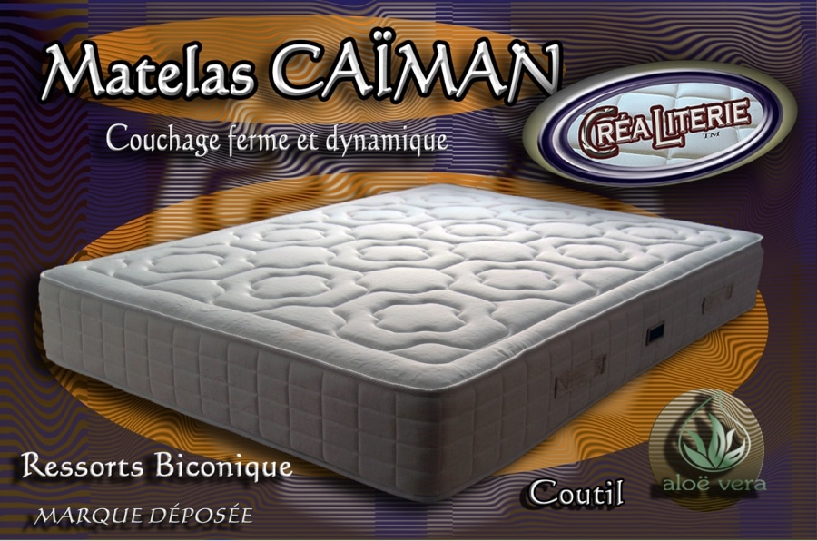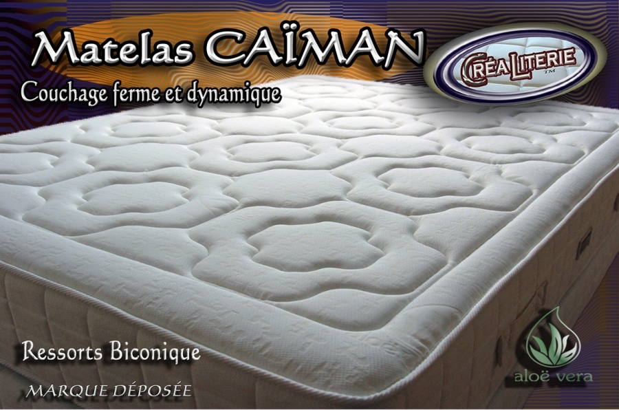 Matelas Caïman Ressorts (PROMO 140×190) coutil Aloé véra Fabrication Française par Créaliterie. Matelas de 336 ressorts thermostabilisés 23/10ème + 30 mm...