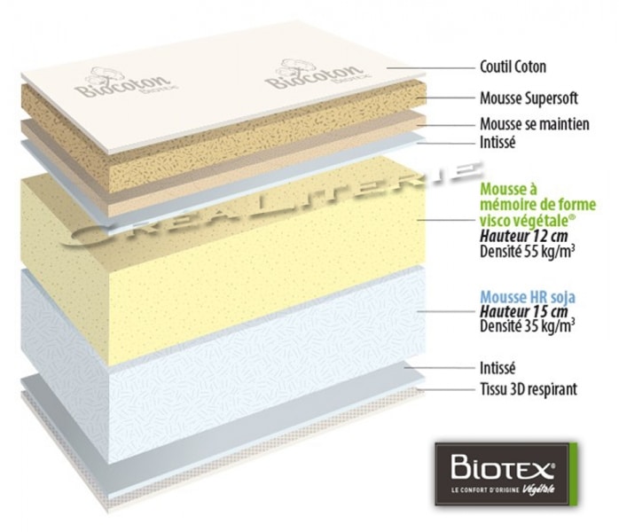 Matelas Bio Tempo sensitive visco végétale à mémoire de forme + mousse haute résilience soja housse Bio Coton par Biotex. ...