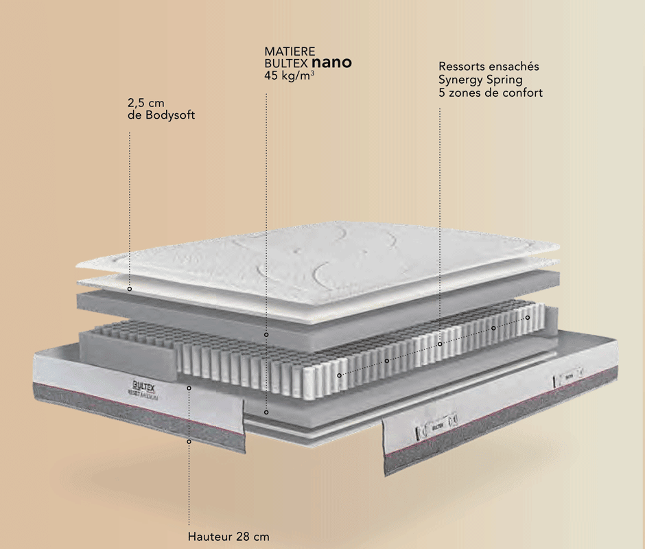 Matelas SAXO 25 cm Bultex nano âme osmose, Accueil Moelleux, soutien équilibré, traité sanitized, fabriqué en France par BULTEX. Matelas Saxo...