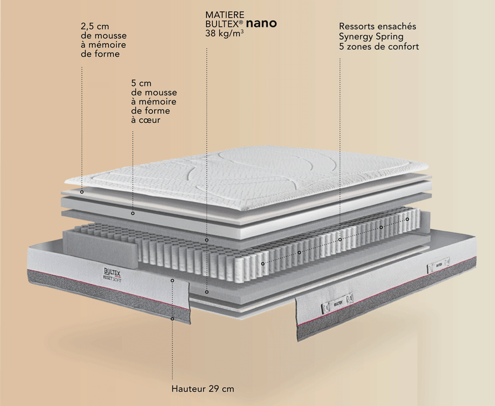 Matelas Reset Soft 29 cm, mousse à mémoire de forme + Bultex nano 38 kg/m³ + ressorts ensachés, 5 zones...