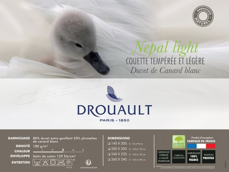 Couette NÉPAL Light légère 180 g/m², en duvet de canard blanc extra gonflant, origine France. Traité anti-acariens Proneem® 100% d’actifs naturels Fabriquée en France par Drouault.