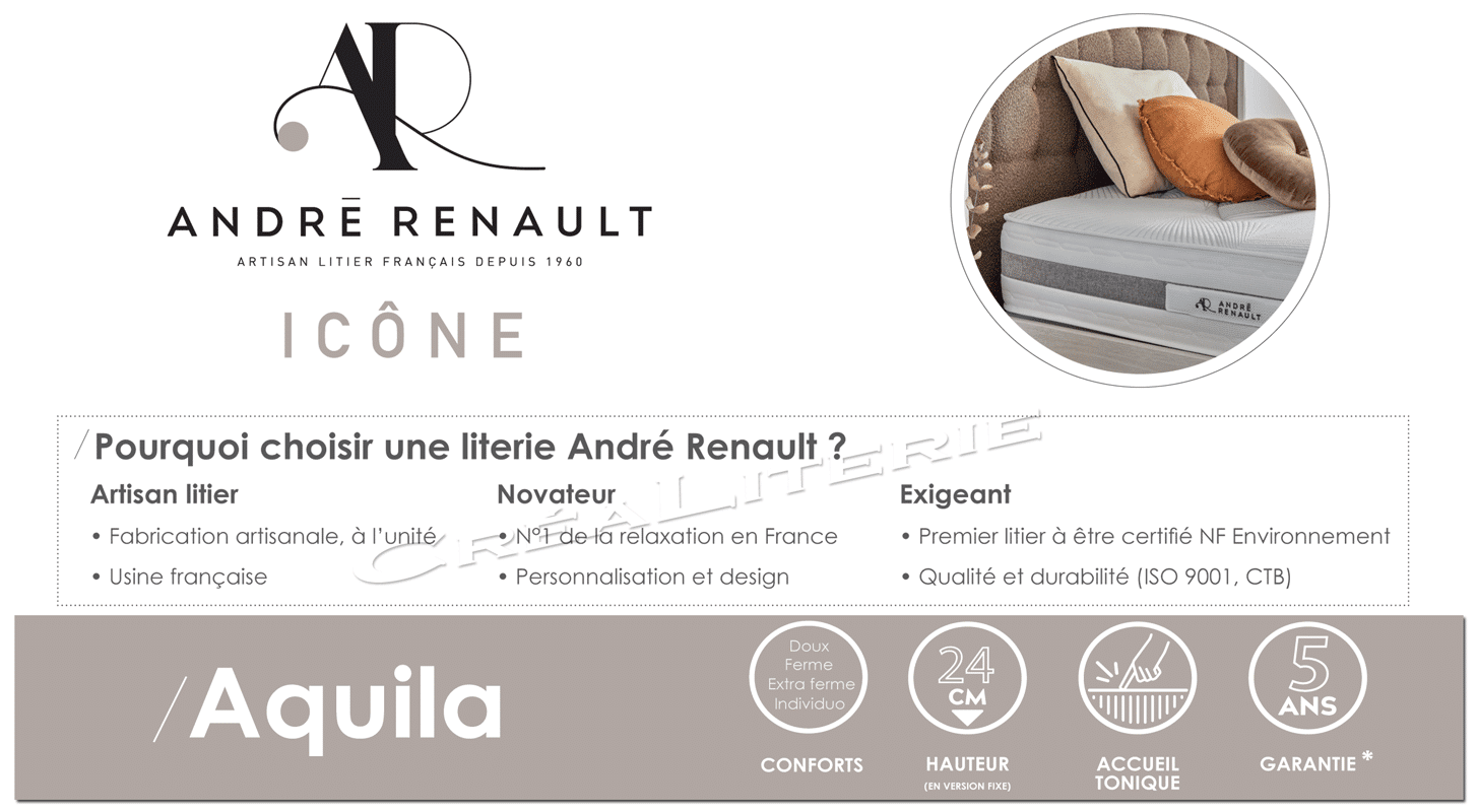 Le matelas Aquila fait partie de la collection André Renault Icône regroupant les technologies incontournables de la marque. La collection Icône c’est la qualité sans compromis, une collection moderne qui va à l’essentiel afin de valoriser l’excellence d’une literie fabriquée à la main.