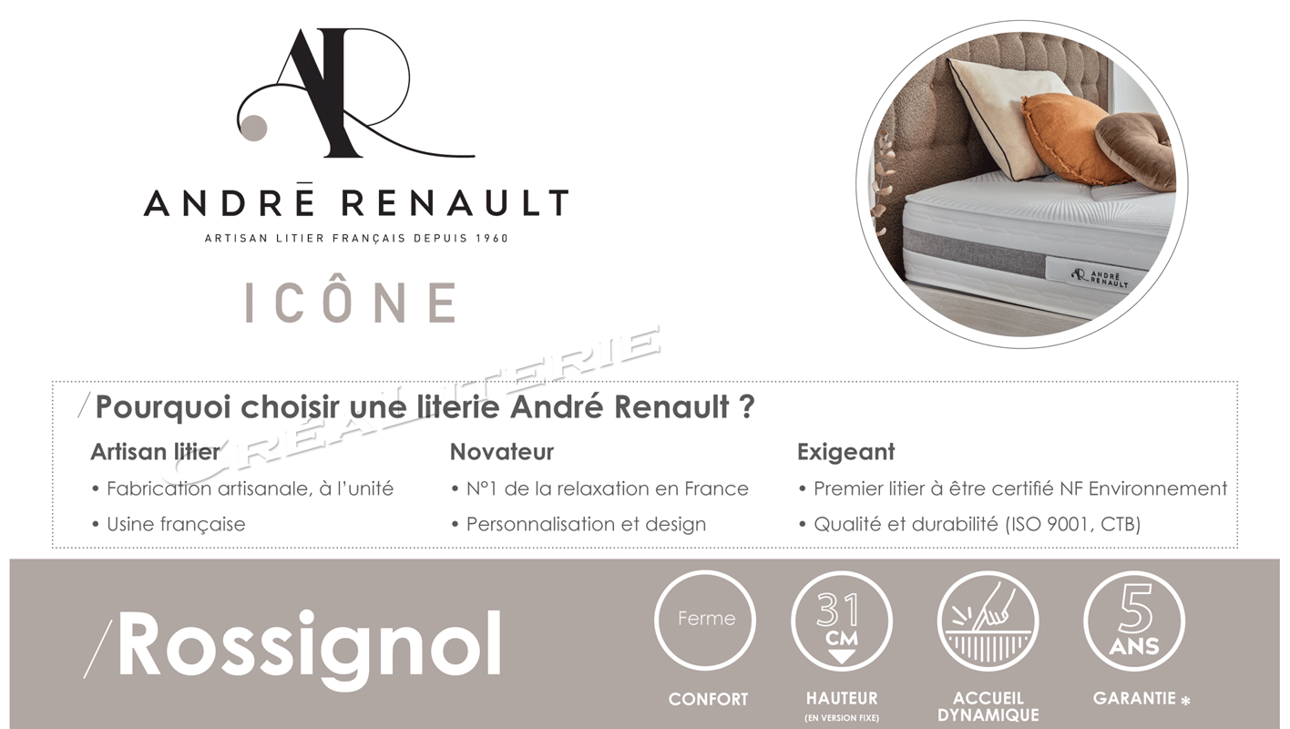Le matelas Rossignol de la collection Icône d’André Renault regroupe les technologies incontournables de la marque. La collection Icône c’est la qualité sans compromis, une collection moderne qui va à l’essentiel afin de valoriser l’excellence dune literie fabriquée à la main.