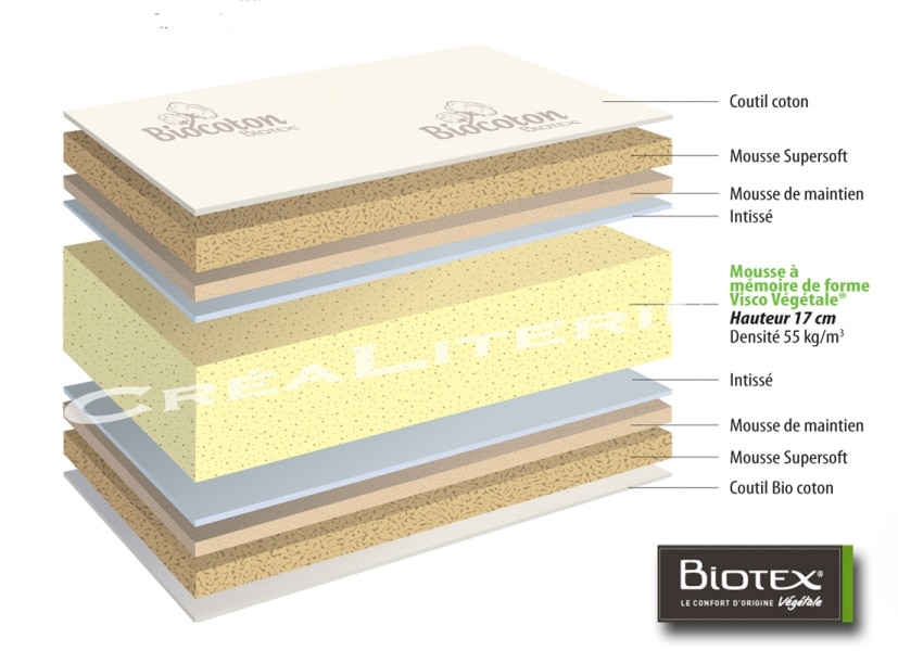 Matelas Biotex Écolux Bio Mémo Confort Ferme visco végétale huile de ricin mémoire de forme 55 kg/m³ Housse Bio Coton