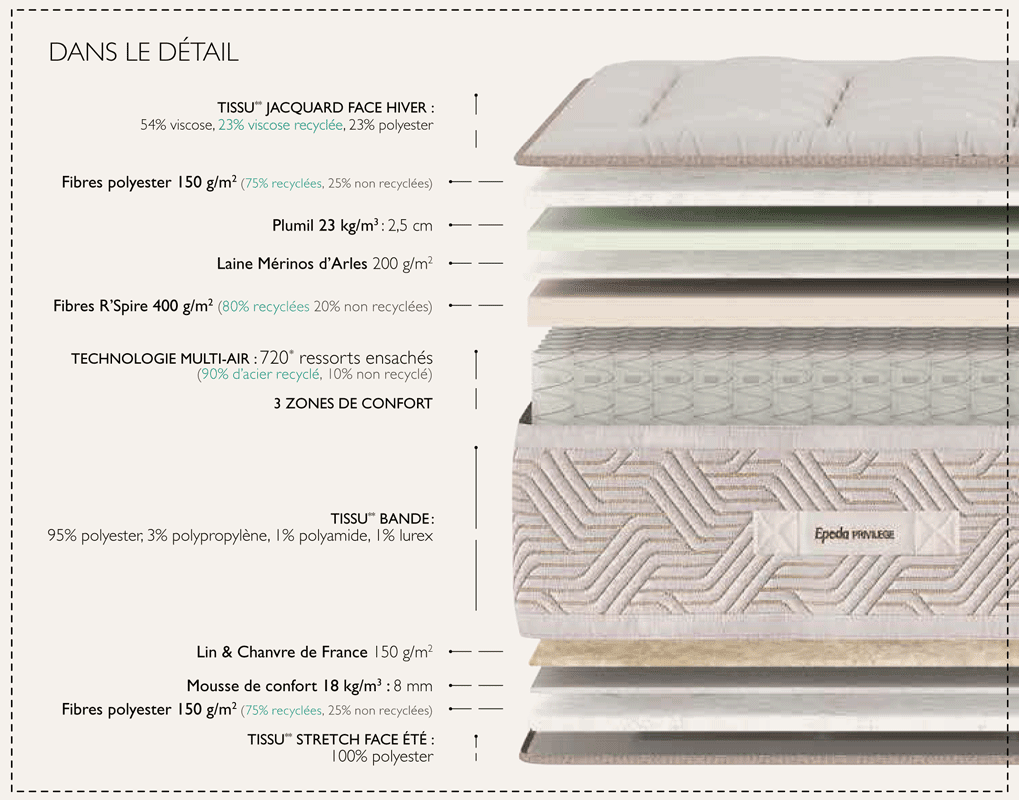 Matelas Épéda Chaillot 29 cm ressorts ensachés multi air 3 zones de confort Fabriqué en France