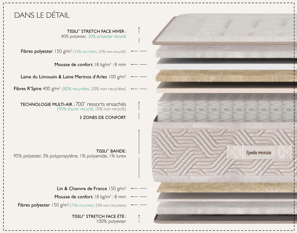 Matelas Épéda Zéphyr 29 cm ressorts ensachés multi air 3 zones de confort Fabriqué en France