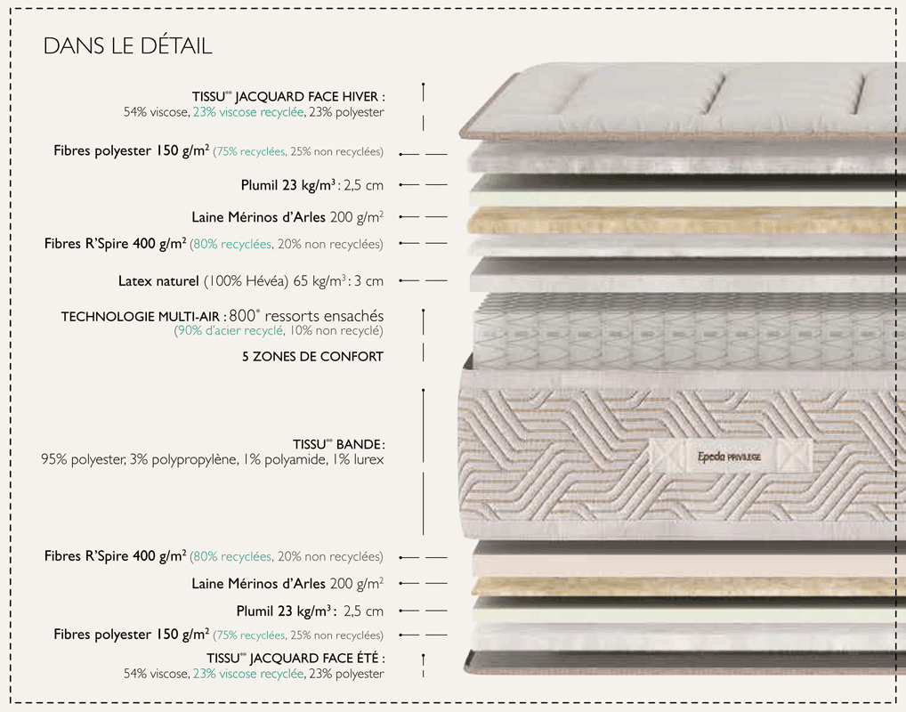 Matelas Épéda Zéphyr 29 cm ressorts ensachés multi air 3 zones de confort Fabriqué en France
