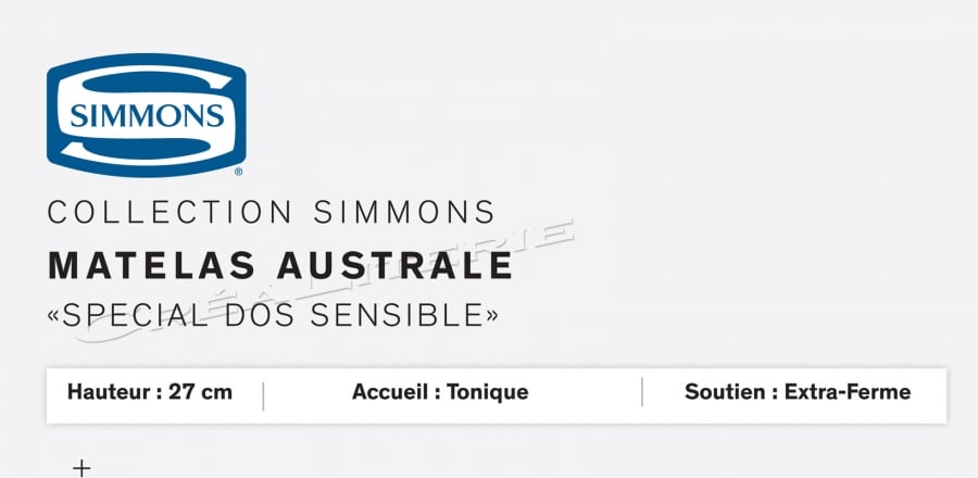 Matelas AUSTRALE Accueil Tonique 713 Ressorts Ensachés Sensoft Intégral® Fabriqué en France par SIMMONS. Matelas spécial dos sensible Matelas AUSTRALE 713 Ressorts Ensachés Sensoft Intégral® pour…