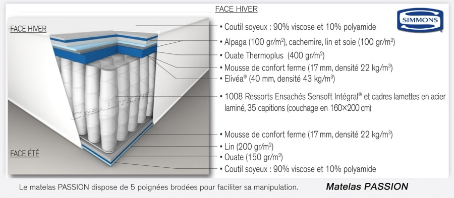 Le matelas Passion Ferme est une création de la marque Simmons, il est fabriqué en France dans l’usine de Saint Amand Les Eaux (59)