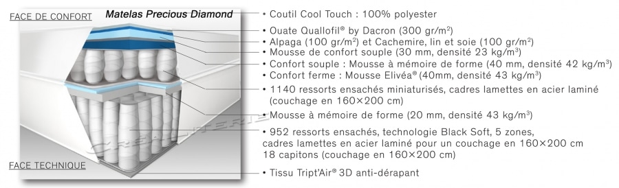 Face de couchage du matelas Precious Diamond black: Coutil soyeux (52% viscose, 20% Biosens, 17% coton et 11% polypropylène) ; Ouate Qualofill® by Dacron® (300gr/m²) ; Alpaga (100gr/m²) ; Cachemire, lin, soie (100gr/m²) ; Mousse de confort souple (30mm) ; Mousse à mémoire de forme (20 mm) ; Pure laine vierge (1 kg/m²) ; Confort ferme Mousse Elivéa® (40 mm) ; Confort souple Mousse à mémoire de forme (20 mm).