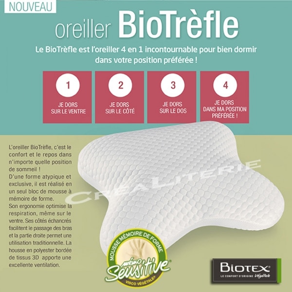 L’oreiller BIOTRÈFLE de BIOTEX a été conçu pour offrir un confort et un repos incomparable dans n’importe quelle position de sommeil.