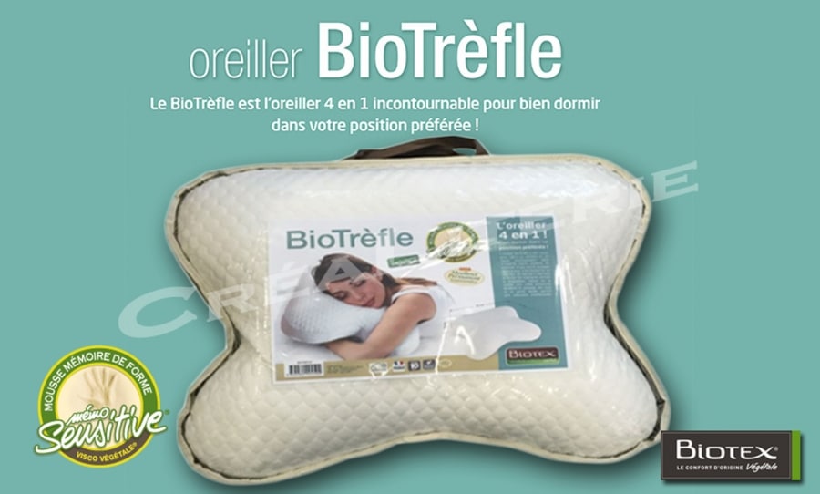 L’oreiller BIOTRÈFLE en mousse à mémoire de forme mémo sensitive élaborée à base d’huile de ricin sans OGM et sans odeur, housse coton Fabrication en France par Biotex.