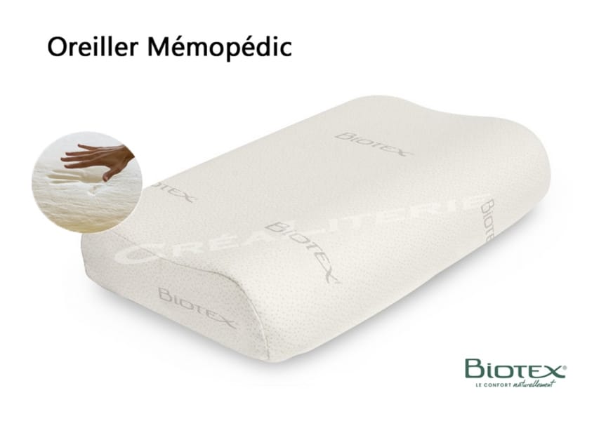 Oreiller Mémopédic mémo sensitive à mémoire de forme élaboré à base d’huile de ricin, housse coton extérieur + housse coton intérieur par BIOTEX.