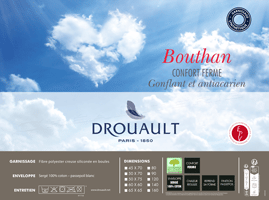 Oreiller Drouault Bouthan fibre polyester creuse siliconée en boules Fabrication Française par Drouault . Oreiller BOUTHAN 100% fibre polyester creuse siliconée en boules, anti-acariens Proneem® Fabriqué…