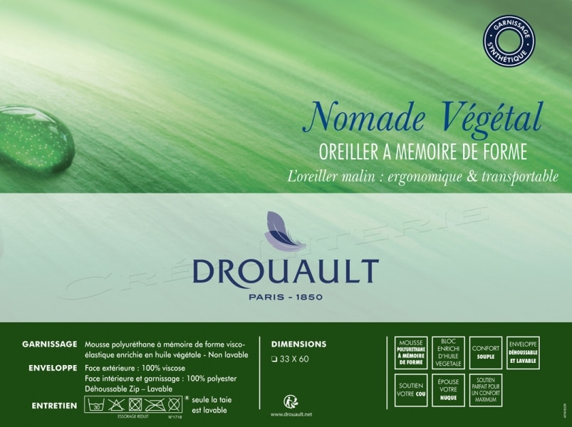 L’oreiller NOMADE Végétal de DROUAULT, d’un grand confort, étudié et réalisé pour une protection maximale de la nuque et des épaules, contribue à un sommeil réparateur grâce à sa mousse viscoélastique thermosensible qui maintient la pression sanguine uniforme.