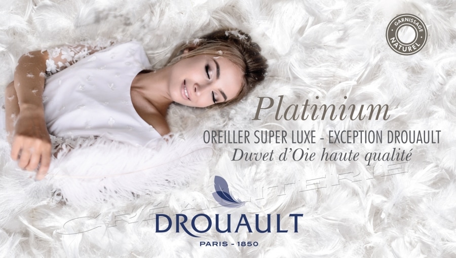 Oreiller PLATINIUM en 100 % duvet d’Oie haute qualité extra blanc d’origine Europe, enveloppe satin de coton 180 fils/cm², Fabriqué en France par DROUAULT. L ’ EXCEPTION DROUAULT « un Oreiller…