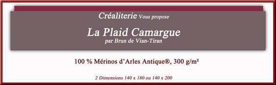 Plaid CAMARGUE 230 g/m² en Mérinos d’Arles Antique® fabrication Française par Brun de Vian-Tiran. Plaid CAMARGUE 230 gr/m² en 100% Mérinos d’Arles Antique®, tissée et…