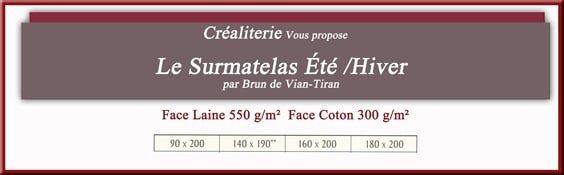 le surmatelas ÉTÉ/HIVER vous séduira par ses nombreuses qualités. Ce surmatelas apportera à vos nuits une sensation de chaleur, de douceur et de moelleux.
