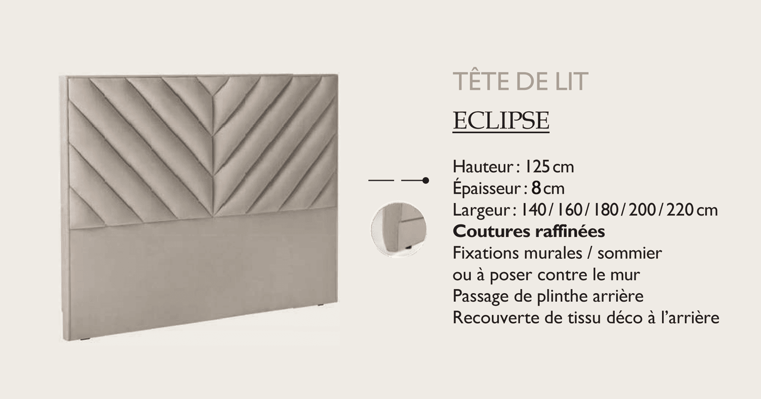 La tête de lit ÉPEDA DÉDICACE Éclipse repose au sol avec une hauteur 125 cm, épaisseur 8 cm, apporte une déco raffinée à votre chambre, elle s’adapte parfaitement avec une literie de la gamme Dédicace Épéda, elle est équipée de passage de plinthe et de patins.